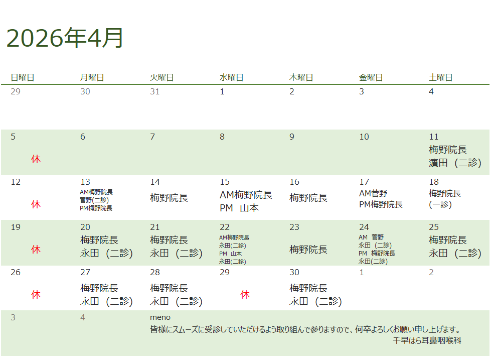 2026/04/10 お知らせ 4月担当医師のお知らせ いつも当院をご利用いただき、誠にありがとうございます。 二診体制となる日および院長不在の日がございますので、あらかじめご確認くださいますようお願い申し上げます。 元のページに戻る